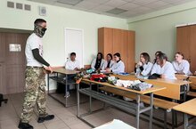 Ребята ознакомились с оказанием экстренной медицинской помощи пострадавшим при огнестрельных и минно-взрывательных ранениях.