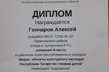 Поздравляем ученика 6 класса Гончарова Алексея с дипломом за 3 место в районном этапе республиканского конкурса «Мирас – объекты культурного наследия Республики Татарстан глазами детей» в номинации «видеоролик». Научный руководитель - Р. Р. Хуснуллина. Желаем дальнейших успехов!