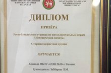Поздравляем команду СОШ 10 в составе Вафина Линара, 10 кл; Нафиевой Азизы, 10 кл; Зайдуллиной Айгуль 10 кл; Юдиной Анастасии, 10 кл; Закирова Раделя, 9б, с тем, что они стали призерами Республиканского турнира по интеллектуальным играм "Историческая память". Выражаем благодарность Л. М.Забаровой - учителю, подготовившему команду!