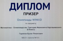 Казанский(Приволжский) федеральный университет провел очные предметные олимпиады Winkid - олимпиады для учащихся 1-6 классов по основным предметам начальной школы. Разработанная Казанским Федеральным Университетом онлайн-система Winkid.ru позволяет отслеживать динамику роста знаний, умений и навыков ребенка, а также получать данные о соотношении его сильных и слабых сторон, благодаря анализу результатов ответов на олимпиадные задания. Учащийся 6Б класса Гарипов Булат принял активное участие в данной олимпиаде по предмету «Математика – Олимпиада им. Г.И. Карташевского» и получил Диплом призера. Поздравляем!!!