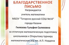 Поздравляем учителя математики Гилязову Гульфию Салиховну с вручением Благодарственного письма за отличную математическую подготовку школьников к Открытому турниру математических игр им. А.П. Нордена