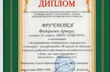 А ученик 9Б класса Федоренко Артур разработал интересный маршрут по г. Казани и получил диплом в конкурсе экскурсоводов «Я шагаю по Казани» (руководитель Марданшина А.Н.)