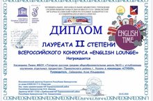Поздравляем ученицу 8 класса Хасаншину Лиану с дипломом лауреата II степени во Всероссийском конкурсе "English lounge" в номинации "Стихи". Учитель - А.И.Сайманова. Желаем дальнейших успехов!