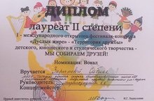 Поздравляем ученицу 7б класса Зарипову Сабину с дипломом лауреата II степени I-го международного открытого фестиваля-конкурса "Дуслык җире" - "Территория дружбы" детского, юношеского и студенческого творчества - МЫ СОБИРАЕМ ДРУЗЕЙ! Конкурс был организован Министерством образования РТ, Управлением образования г.Казани, Казанским отделением Всемирного конгресса татар, Ассамблеей народов РТ и многопрофильной полилингвальной гимназией №180 Советского района г.Казани. Учитель - К.К.Мифтахутдинова. Желаем дальнейших успехов!
