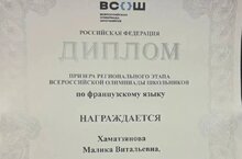 Поздравляем призёра регионального этапа Всероссийской олимпиады по французскому языку ученицу 9 Б класса Хаматзянову Малику! Молодец! Гордимся! Дальнейших успехов!