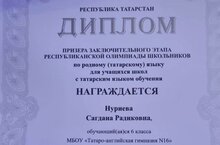 Татар теленнән республика олимпиадасының йомгаклау этабы призёрлары Гарипова Азалия-8 Б (укытучысы Шакирова А.Р.), Нуриева Сәгъдәнә-6 Б (укытучысы Идрисова Л.М.), Садыкова Азалия, Мостафина Әминәне-7 Б (укытучылары Гыйниятуллина А.Р.) чын күңелдән котлыйбыз! Алга таба да уңышлар телибез!