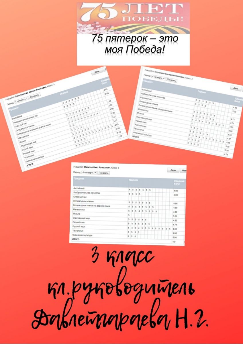 Участники "75 пятерок - это наша Победа" стремились получать отличные знания и высокие оценки по школьным предметам, тем самым совершая победу над собой, так как учиться "на отлично" сложно. Для просмотра жмите здесь: