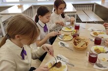 Приготовление горячего завтрака в школьной столовой гимназии