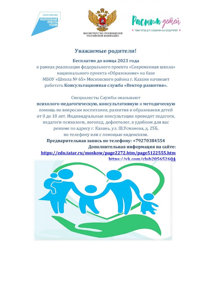 В рамках реализации федерального проекта «Современная школа» национального проекта «Образование» на базе МБОУ «Школа №65» Московского района г.Казани начала работать Консультационная служба «Вектор развития» (далее – Служба). Работа Службы будет организована до конца 2023 года, помощь оказывается на безвозмездной основе.