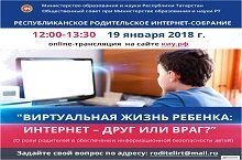 Уважаемые родители! 19.01.2018 с 12.00 до 13.30 состоится Республиканское родительское интернет-собрание «Виртуальная жизнь ребенка: интернет – друг или враг?».( О роли родителей в обеспечении информационной безопасности детей.) Задать свои вопросы вы можете по адресу:roditelirt@mail.ru. Он-лайн трансляция собрания будет вестись на сайте Казанского инновационного университета имени В.Г.Тимирясова по адресу: https://ieml.ru/.