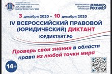 С 3 по 10 декабря 2020 года в целях оценки уровня правовой грамотности населения пройдет Четвертый Всероссийский правовой (юридический) диктант. Основные задачи диктанта - повышение мотивации различных слоев населения к изучению права, получение объективной информации об уровне правовой грамотности населения России с учетом его возрастной и социальной структуры, привлечение средств массовой информации и российского общества к вопросу повышения уровня правовой культуры населения, выработка предложений по совершенствованию образовательных программ.