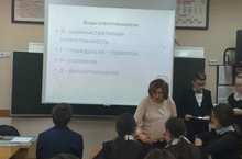 В гимназии продолжается работа по реализации месяца профилактики правонарушений. 18 ноября в рамках данного месяца в 8б классе прошёл тематический классный час Ребята сами подготовили сообщения о видах юридической ответственности. Педагог предлагал ребятам решение практических заданий. Работа шла как индивидуально, так и в группах.
