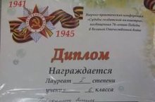 19 апреля в преддверии праздника Великой Победы в школе №129 состоялась районная НПК «Судьбы солдатской километры». По итогам конференции ученик 6б класса Гибадуллин Эмиль был награждён Дипломом Лауреата I степени. Поздравляем с победой! Молодец! Так держать!