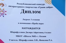 Поздравляем ученицу 6А класса Шарифуллину Диляру с Дипломом Лауреата 1 степени в республиканском конкурсе литературного творчества "Грани Добра" 19.05.2023