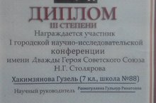 поздравляем ученицу 7А класса Хакимзянову Гузель и ее научного руководителя Рахматуллину Г.Р. с дипломом 3 степени на 1 городской научно-иследовательской конференции имени дважды героя Советского Союза Н.Г.Столярова