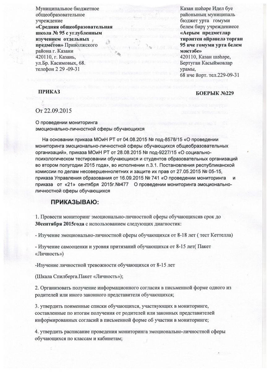 Приказ Отдела образования о проведении мониторинга эмоцианально-личностной сферы обучающихся ОО