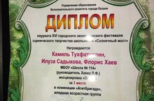 Поздравляем учащихся 3 Б класса Тухфатуллина Камиля, Садыкову Илузу и Хаева Флориса, которые заняли 3 место в номинации "Агитбригада " в XVI городском экологическом фестивали сценического творчества школьников "Солнечный мост" при поддержке своего классного руководителя Хаевой Лилии Фаатовны!!
