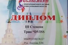 Поздавляем трио "DVISS" Лауреата 3 степени Международного конкурса -фестиваля речевого и вокального искусства, руководитель Ахатова Л.М.