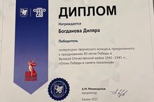 Поздравляем Богданову Диляру с Дипломом победителя литературно - творческого конкурса, приуроченного к праднованию 80- летия Победы в Великой Отечественной войне 1941-1945 года "Огонь Победы в памяти поколений", руководитель Салахова Р.Р.