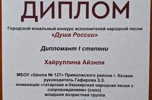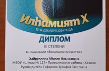 ПоздравляемХайруллину Айзилю с Дипломом у степени Международного конкурса- фестиваля речевого и вокального искусства "Илhамият Х", руководитель Гафарова З.З.