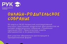 30 марта в 18.00 Казанский кооперативный институт приглашает родителей абитуриентов на онлайн родительское собрание «Приемная кампания 2021. Практические советы абитуриентам и их родителям».