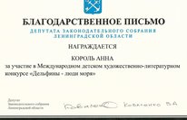 Учащаяся 6 "А" Король Анна (руководитель Зигангирова Ю. Ф.) награждена благодарственным письмом за участие в Международном детском художественно-литературном конкурсе "Дельфины-люди моря"