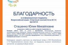 Учителю физической культуры Сташенко Юлии Михайловной выражается благодарность за поддержку Всероссийской акции "Спортивный лонгмоб Сочи-2014"