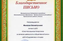 Благодарственным письмом была награждена ученица 9 класса Хисматуллина М. за автивную деятельность в общественной жизни ДОО "Содружество" и "Лидер".