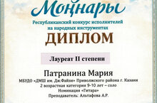 Звания лауреатов II степени удостоены Комиссарова Юлия, Нигашева Арина (преп-ль Денисова С.Д., конц-р Файрушина А.Р.) и Патранина Мария (преп-ль Альтафова А.Р.).