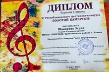 Шакирова Зария - Лауреат 1 степени в номинации "Теория и история музыки" VI Республиканского конкурса-фестиваля "Золотой Камертон", преподаватель Бакирова Гузель Шарифзяновна