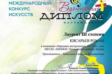 14-ый диплом ДМШ20 в копилку побед Международного конкурса искусств "Вдохновение" - Номинация "Народные инструменты" Кисарьев Роман Лауреат III, преподаватель Зайнуллина Светлана Валентиновна