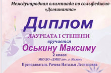 Поздравляем учащегося класса преп. Рачевой Н.Л. - Оськин М. - Лауреат I ст. Международной олимпиады по сольфеджио "Доминанта"