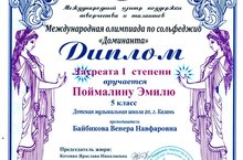 Поздравляем учащегося класса преподавателя Байбиковой В.Н. - Поймалина Эмиля - Лауреат I ст. Международной олимпиады по сольфеджио "Доминанта"