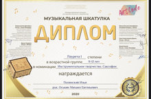 Поздравляем учащегося ДМШ № 20, класс преп. Оськина М.Е. - Полянского И. - Лауреат I ст. в номинации "Инструментальное исполнительство. Саксофон" Международного конкурса инструментального творчества "Музыкальная шкатулка"