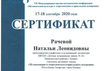 VII Международная научно-методическая конференция "Музыкальная культура в теоретическом и прикладном измерении" - Сертификат участника заседания секции "Музыкознание в теоретическом и прикладном измерении" получила преподаватель теоретичсеких дисциплин ДМШ № 20 - Рачева Н.Л.