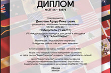 VI Международный конкурс для детей и молодежи "ВСЕ ТАЛАНТЛИВЫ" - Долотин А. - Победитель I место, преп. Фахразиева Г.Ф.