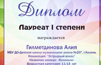 Звёздный дождь побед учащихся ДМШ № 20 в IV Международном конкурсе музыкального исполнительства "KAZAN-MUSIC ЙОРТ" - преп. ДМШ № 20 - Иляева С.Ф. - Лауреат II ст., Сертификат участника мастер-класса доцента кафедры эстрадно-джазовой музыки, кандидата философских наук КГИК- А.Р. Вознесенской "Базовый уровень осовения вокальной техники начинающего" в рамках IV Международного конкурса музыкального исполнительства "KAZAN-MUSIC ЙОРТ" ;Поймалин Э. - Дипломант I ст., Дуэт: Полянский И., Поймаин Э. - Дипломант II ст., Полянский И. - Лауреат III ст., преп. Иляева С.Ф., Силантьева Д. - Дипломант II ст., преп. Гиниятуллина Л.М.преп. ДМШ № 20 - Фатыхова Р.И. - Лауреат II ст., Сертификат участия в мастер-классе старшего преподавателя кафедры музыкально- инструментального исполнительства КГИК М.М. Нагорнова " Некоторые аспекты подбора аппликатуры в произведениях для классической гитары" в рамках IV Международного конкурса музыкального исполнительства "KAZAN-MUSIC ЙОРТ"Гиниятуллина Л.М. -Сертификат участника Мастер-класса старшего преподавателя кафедры музыкально-инструментального исполнительства КГИК Н.Ф. Сагдиева "Формирование навыков подбора по слуху в сольном исполнительстве и аккомпанементе на баяне"Полянский И. - Лауреат II ст., преп. Оськин М.Е., конц. Хлесткина С.М.Мубаракова Ш.Т. - Сертификат участника мастер-класса доцента кафедры эстрадно-джазовой музыки КГИК А.А.Руденко "Формирование элементарных навыков джазовой импровизации у детей на примере обработки мелодий из мультфильмов и известных детских песен" в рамках IV Международного конкурса музыкального исполнительства "KAZAN-MUSIC ЙОРТ" -