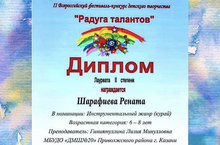 Поздравления принимает учащаяся ДМШ20 Шарафиева Рената - класс курая преподавателя Гиниятуллиной Лилии Минулловны - Победа во II Всероссийском фестивале-конкурсе "Радуга Талантов" г.Липецк