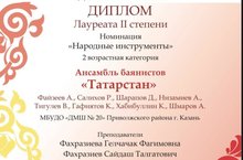 Аплодисменты поздравлений звучат в адрес яркого дружного талантливого коллектива мальчиков народного отделения ДМШ20 и их преподавателей Фахразиевых Гельчачак Фагимовны и Сайдаша Талгатовича - Ансамбль баянистов «Татарстан» Лауреат II ст.