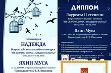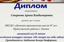 Поздравляем ученика 2 класса ДМШ20 Яхина Мусу и его педагога Киселёву Т.В. с Успехами и Победами во Всероссийском онлайн-конкурсе "Не скучно дома_младшие классы"! -