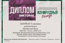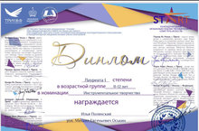 l Международный фестиваль детского и юношеского творчества «Изумрудный дождь». ( город Оренбург).Лауреат l степени ученик 5 класса Полянский Илья., Лауреат III степени - Лутфуллина ЖаклинПреподаватель: Оськин Михаил Евгеньевич. Концертмейстер: Хлесткина Светлана Михайловна. -