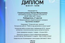 Гиниятуллина Лилия Минулловна - Победитель 1 место XV Всероссийского педагогического конкурса "На пути к успеху"
