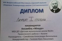 Всероссийский фестиваль хоровой музыки "Хоровая Универсиада им. С. В. Смоленского" - Фольклорный Ансамбль «Млада», преп. Самойлова А.В., конц. Гилязов И.В. - Лауреаты I степени. Так же Ансамблю был вручен Диплом «За Лучшее исполнение народной песни!»