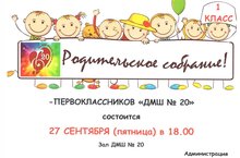 27 сентября (пятница) в 18.00 состоится Родительское Собрание Первоклассников. Зал ДМШ № 20