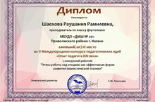 Шаехова Р.Р., преподаватель ДМШ № 20, заняла III место во II Международном конкурсе педагогических идей "Опыт педагога XXI века" с конкурсной работой: "Этапы работы над этюдами как эффективная форма развития пианистической техники"