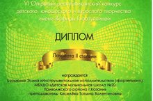 Поздравляем Бурыкину Элину, класс преподавателя Киселёвой Т.В. - Лауреат II степени VI Открытого Республиканского конкурса детского, юношеского и взрослого творчества имени В.Гизатуллиной