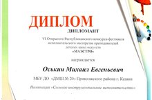 Поздравляем Оськина Михаила Евгеньевича - Дипломанта Открытого Республиканского конкурса-фестиваля исполнительского мастерства преподавателей "Маэстро"