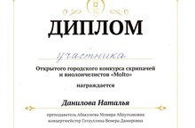 Поздравляем Дипломанта - Открытого городского конкурса скрипачей и виолончелистов "Molto" - Данилова Наталья - преп. Абакумова М.А., конц. Гатауллина В.Д.;