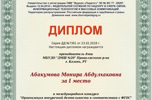 Диплом за I место преподавателю ДМШ № 20 - Абакумовой Монире Абдулхаковне в Международной конкурсе "Организация внеурочной деятельности в соответсвии с ФГОС"