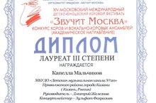 Поздравляем капеллу мальчиков ДМШ № 20, руководитель Железнов Дмитрий Игоревич, концертмейстер Фахразиев Зульфат Талгатович. Они стали Лауреатами III степени XIV Московского Международного детско-юношеского хорового фестиваля "Звучит Москва". В фестивале приняли участие более 100 коллективов со всей России и из-за рубежа. Конкурсные прослушивания и концерты прошли на лучших концертных площадках столицы: зал церковных соборов храма Христа Спасителя, Московский международный Дом музыки, Большой зал Московской государственной консерватории им. П. И. Чайковского, Государственный музей А. С. Пушкина, музеи-заповедники "Коломенское" и "Царицыно". Желаем им дальнейших творческих побед!!!